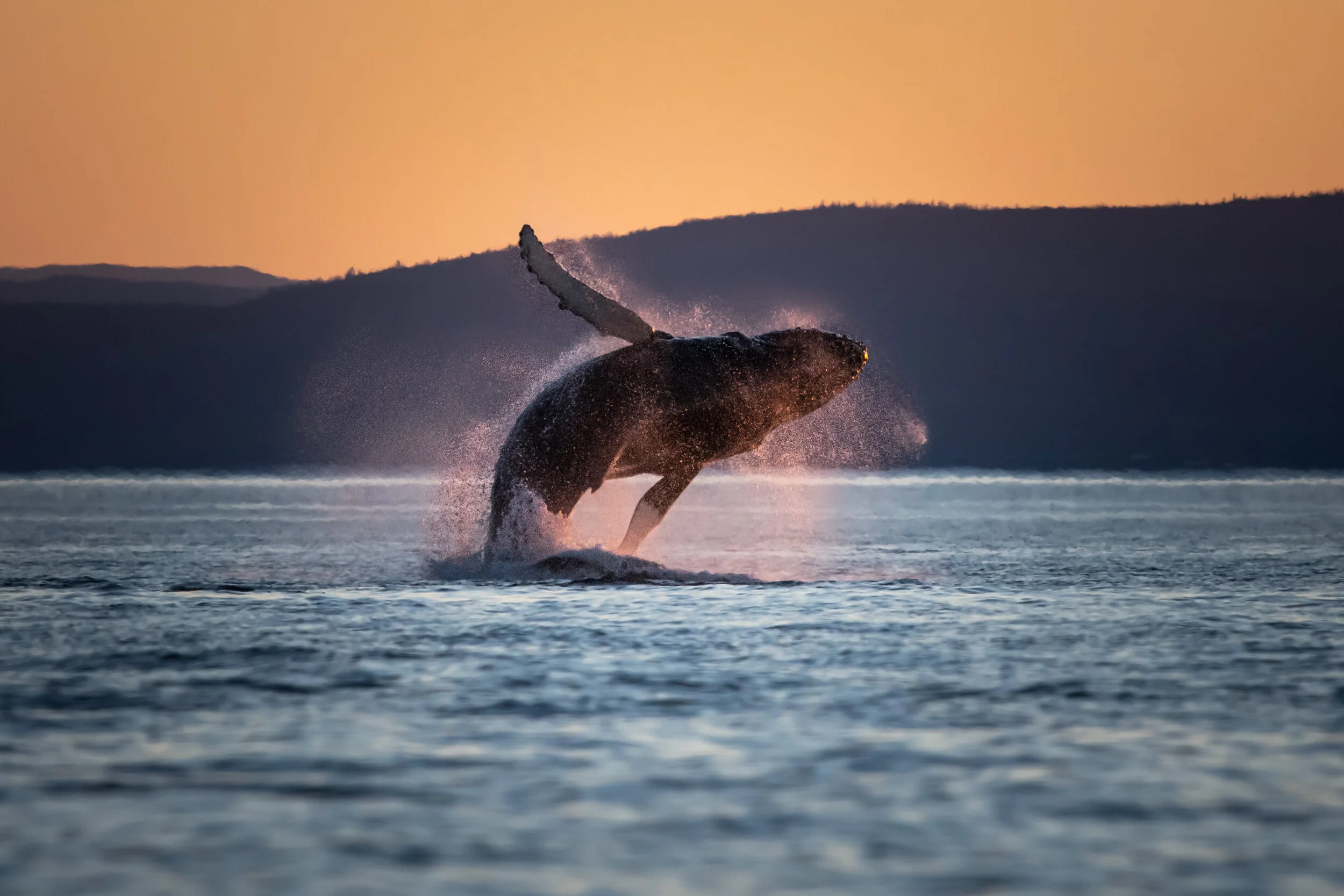 Je venais de vivre l'une des plus belles croisières de ma vie. Nous étions au large de Bergeronnes sur le fleuve, à bord du P-34. Le coucher de soleil était exceptionnel! Durant les deux heures passées en mer, nous avions observé près d'une dizaine de rorquals à bosse différents, tous très actifs. Coups de nageoires, coups de queue, têtes hors de l'eau, interactions et sauts de haute voltige. Moi qui ai passé pourtant beaucoup de temps avec les baleines depuis 2010, je n'avais jamais vu un tel spectacle. Souvent, il faut faire preuve de patience. On vogue lentement, on observe au loin, on essaye de "spotter" les souffles et les éclaboussures qui se trouvent à plusieurs kilomètres, puis on tente l'approche. Des fois ça marche, d'autres non. Et seulement lorsque l'on est vraiment chanceux, une des nombreuses baleines à bosse du secteur nous offrira un spectacle de quelques courtes minutes pour nous faire rêver. Parfois, quelques secondes. Ces comportements sont plutôt rares ici, dans leur aire d'alimentation. Les sauts et les coups en surface de toutes sortes sont habituellement associés à la période de reproduction, qui se passe dans les eaux plus chaudes, au sud. Mais pas cette année, et je n'ai aucune idée pourquoi! Cette croisière-là, nombre de petits rorquals, rorquals communs et phoques tournaient rapidement un peu partout en pleine chasse de leurs proies favorites : copépodes, krill, petits poissons de toutes sortes... Puis, les bosses. Nous avons vu tout ce que l'on peut espérer voir d'incroyable d'une baleine à bosse et ce sans temps d'arrêt durant toute la sortie. Nous étions sur le point de quitter puisqu'il commençait à faire sombre.Le soleil était en train de disparaître derrière les montagnes. On n'en voyait plus son centre lumineux, seuls quelques rayons tenant bons pour éclairer le fleuve pour les quelques prochaines secondes de lumière qu'il restait avant de disparaitre à leur tour. Le bateau s'est mis en marche. La croisière de rêve était terminée. On moment où nous avions quitté la zone, le bateau s'est mis à prendre de la vitesse. J'ai regardé une dernière fois à l'arrière, comme pour leur dire au revoir! Et cette baleine, au loin, éclairée par ces tout petits éclats de lumière, m'a offert l'un des plus beaux breach que j'ai eu la chance de voir dans ma vie.
