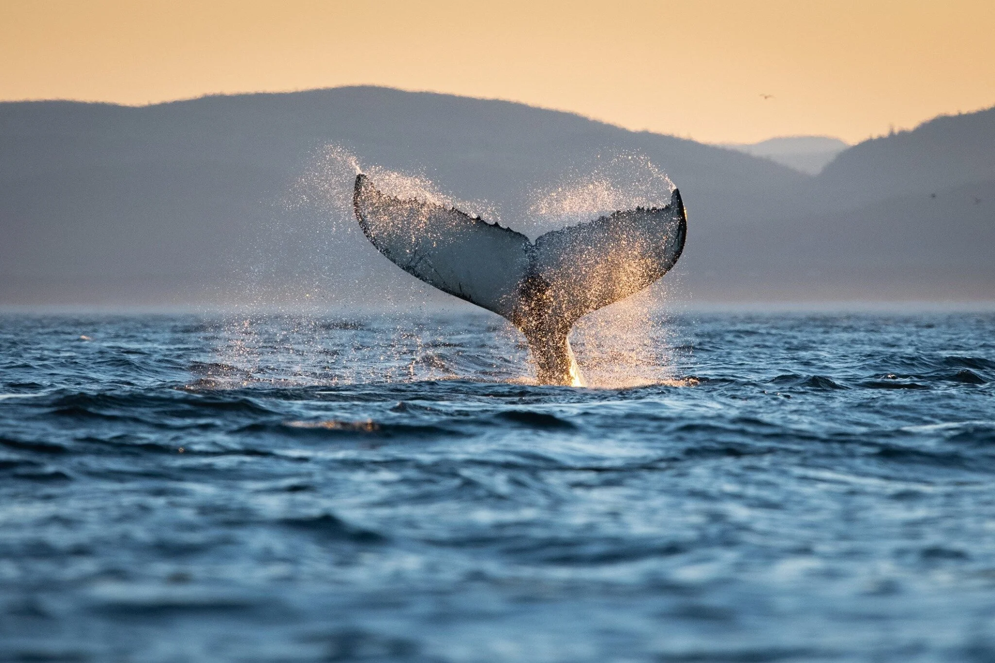 Le baleineau de Tic Tac Toe est vraiment drôle à voir aller! Il est très actif, beaucoup plus que les baleines adultes. Parfois, les grandes, dont sa mère, partent vers les profondeurs de longues minutes et lui reste seul à la surface pour explorer et rester actif. À la manière d'un chiot, il semble joueur et en pleine découverte de son environnement. On dirait qu'il expérimente différentes choses pour prendre conscience de ce qu'il peut faire avec ses longues nageoires et sont corps démesurément grand (bien qu'encore petit pour une baleine à bosse!). Il est aussi très curieux, je l'ai vu à quelques reprises s'approcher des bateaux pour les observer. À chaque croisière que j'ai faite dans les derniers jours, il nous a fait vivre beaucoup d'émotions et m'a bien fait rire par son comportement de jeune baleine. Sur cette image, les 3 adultes qui étaient avec lui en surface avaient quitté depuis un bon moment pendant que lui tapait de la queue à répétition dans le soleil couchant. Les gouttelettes et le soleil en contre-jour donne souvent de superbes images! Une autre image prise sur le majestueux Fleuve Saint-Laurent, au large de Tadoussac.